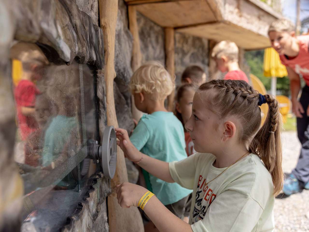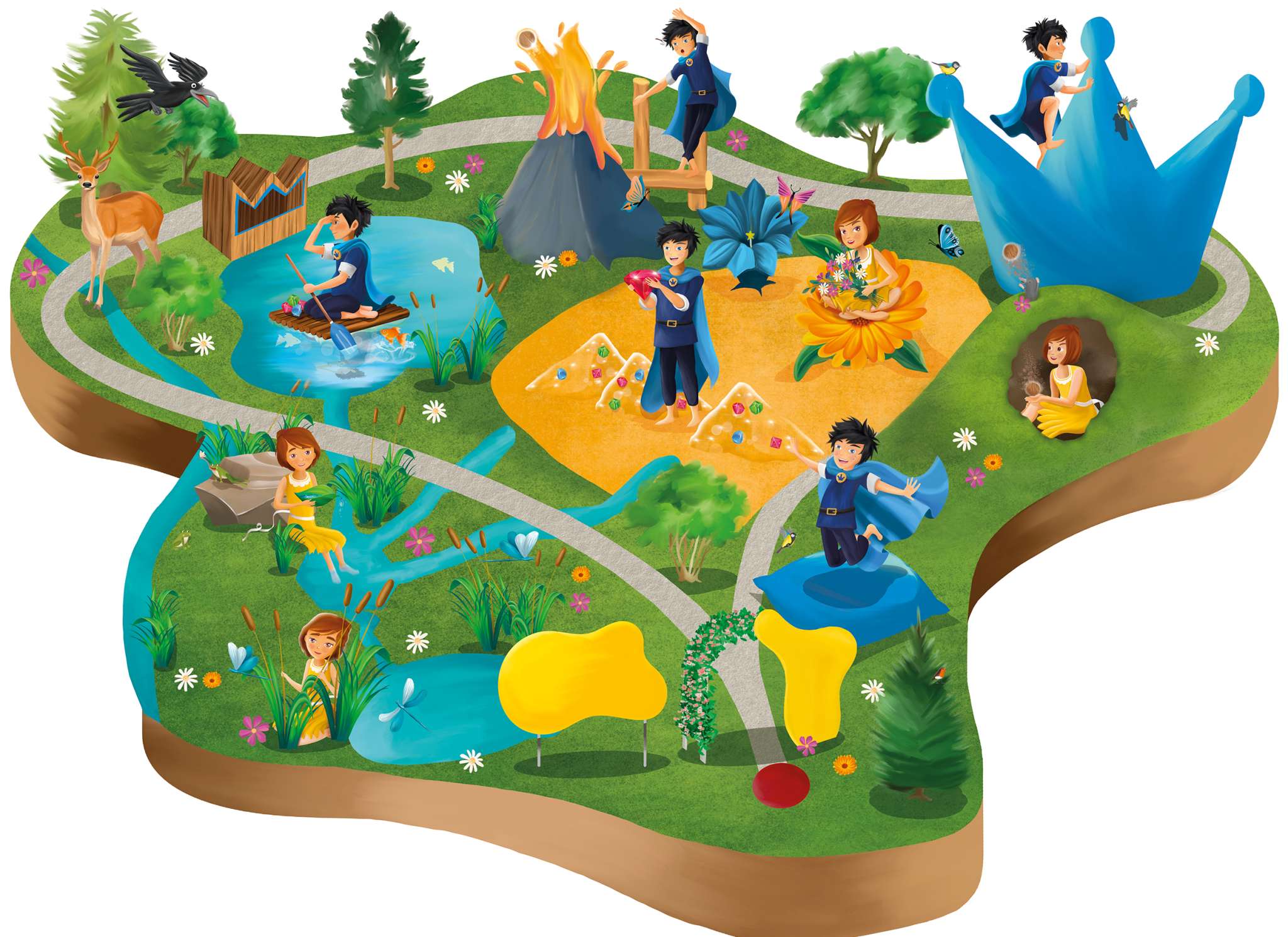 9 adventure stations with puzzles and lots of interesting facts about plants and animals as well as a ball park await you to explore. A climbing crown, a water world with raft, water games and a koi pond invite you to new adventures. Or try the giant trampoline for unimagined flights of fancy.