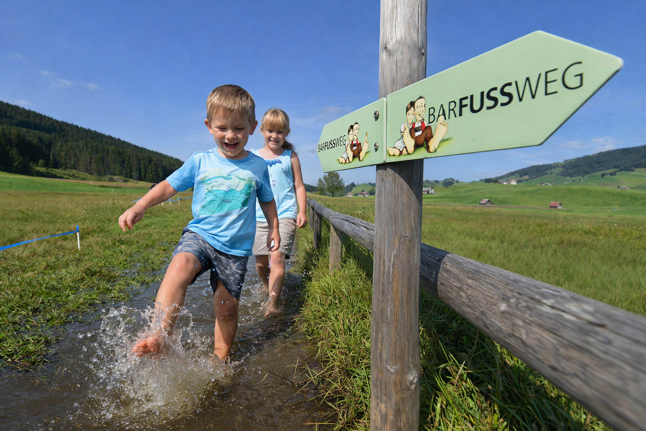 This hike starts in Gontenbad. But first you have to take off your shoes and socks. The trail leads you through a moorland landscape to the Toobeschopf Museum. There you can bathe your arms in a special fountain in the style of Dr. Kneipp. You continue towards Gonten across meadows and streams with short stony or asphalted sections. You will experience unusual sensory impressions while walking barefoot. From Gonten, the trail continues across green meadows to the end point. Shortly before Jakobsbad, you have the opportunity to wash your feet in the stream.